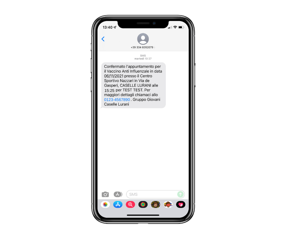 Dopo l'inserimento dei dati anagrafici e del numero di cellulare viene inviato un SMS all'utente con un riepilogo della prenotazione.